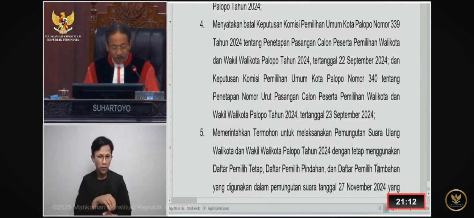 Diketahui, MK menggelar sidang putusan Pilkada Palopo, Senin (24/2). Sidang tersebut dipimpin Ketua MK, Suhartoyo.