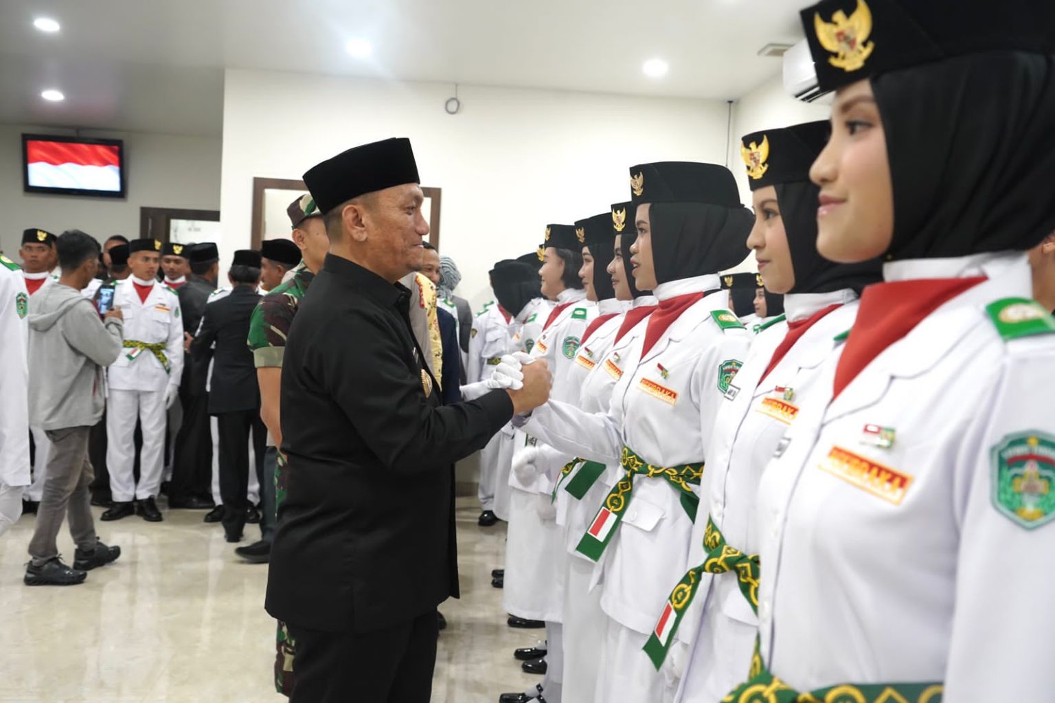 Media Malili- Bupati Luwu Timur, H. Irwan Bachri Syam, bersama Forum Koordinasi Pimpinan Daerah (Forkopimda) mengukuhkan 70 Pasukan Pengibar Bendera Pusaka (Paskibraka) Merah Putih Kabupaten Luwu Timur Tahun 2025, di Aula Awana Wisma Trans, Kamis (14/8/2025).